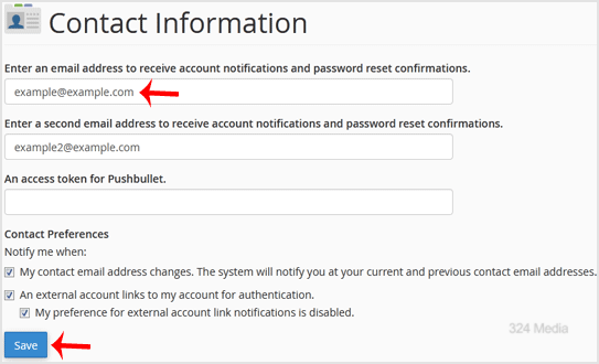 3. You should see an input box below the line that says, Enter an email address to receive account notifications and password reset confirmations. Update your existing email address or add your secondary email address in the second email input box.